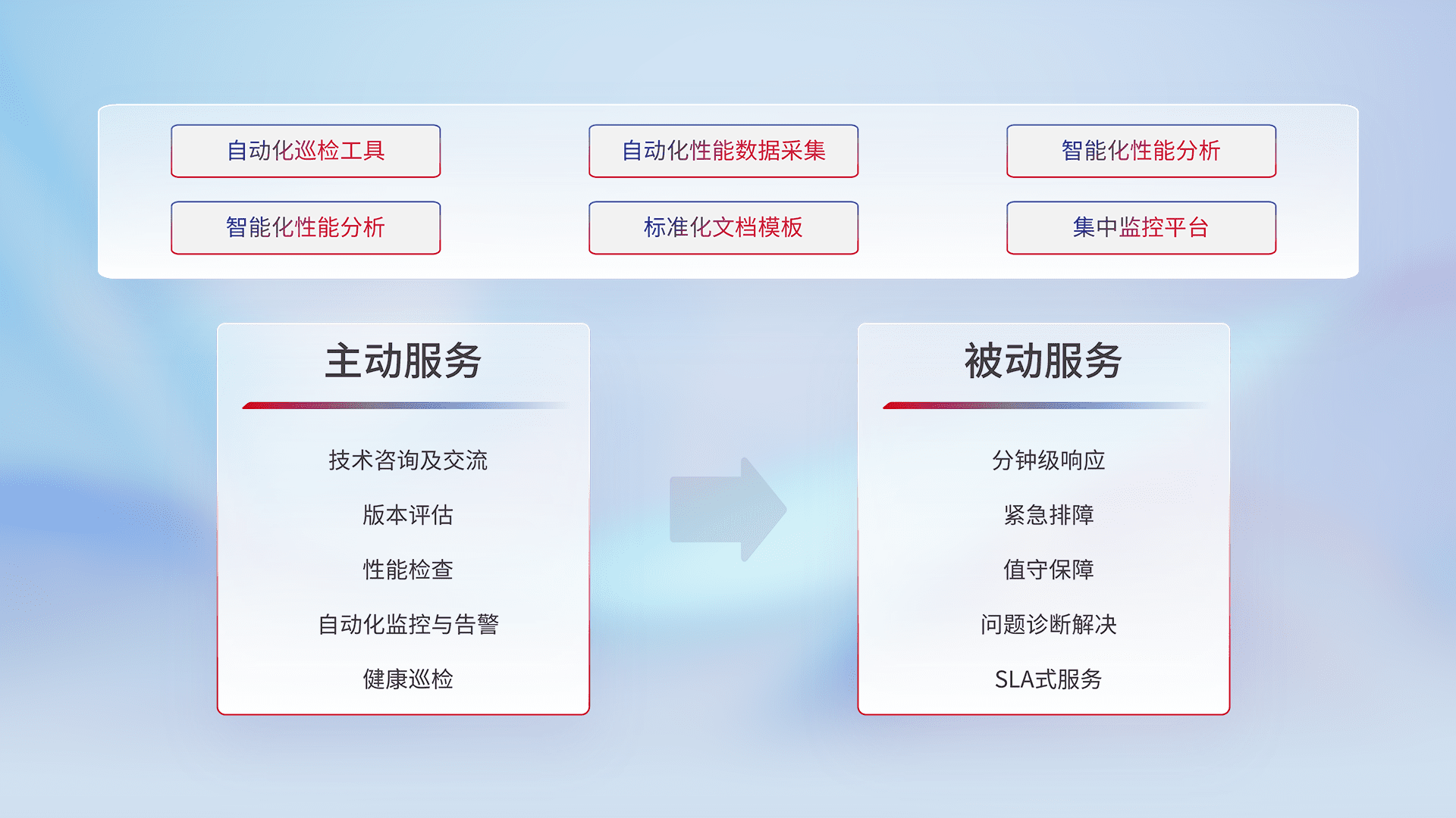 智能化工具和标准化文档,,,保障服务质量,,提供主动服务(包含技术咨询、、、版本评估、、、性能检查、、、、自动化监控与告警、、健康巡检)和被动服务包含(分钟级响应、、、、紧急排障、、、、值守保障、、问题诊断解决、、、、SLA服务)。。